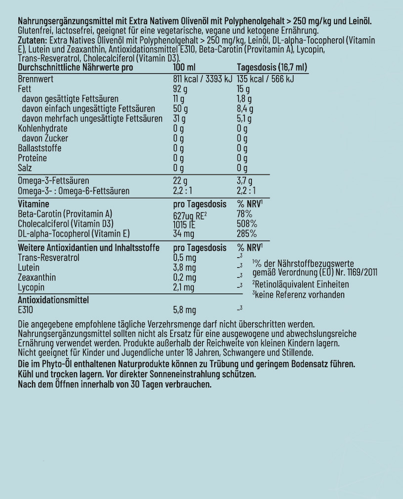 Die optimierte, harmonische Kombination von Olivenöl und Leinöl verleiht YuvenLife seinen charakteristischen Geschmack und sorgt für eine bestmögliche Bioverfügbarkeit der sorgfältig ausgewählten Vitamine und Antioxidantien.